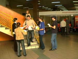Принудительное одаривание посетителей рекламными материалами. Вот кто работает на выставке - так это раздатчики флайеров! |