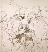 На следующее утро в хирургическом отделении обход. Около меня заведующий отделением - маленький, но очень важный доктор в накрахмаленном колпаке, очень высоком, чуть ли не до потолка, останавливается надолго. Вся свита делает вид, что очень внимательно слушает.
